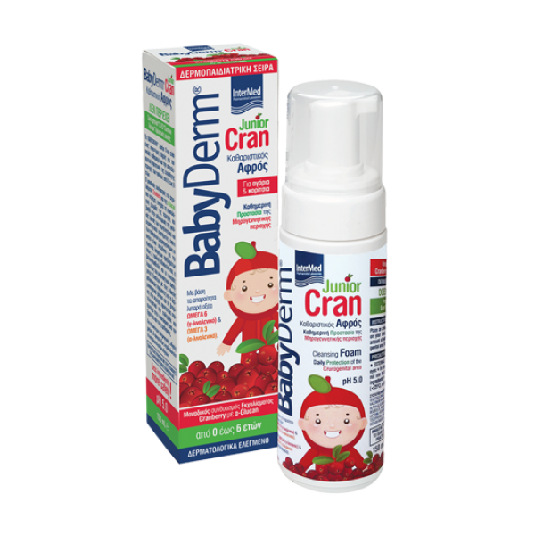 Το BabyDerm Junior Cran είναι ένας καινοτόμος αφρός για τον απαλό, καθαρισμό και την αποτελεσματική προστασία της ευαίσθητης περιοχής των παιδιών, από 0 έως 6 ετών. Ο μοναδικός συνδυασμός του εκχυλίσματος cranberry και της a-glucan που περιέχει, ενισχύει τη φυσιολογική χλωρίδα της περιοχής και βοηθά στην ενδυνάμωση της φυσικής άμυνας των περιγεννητικού και ουροποιητικού συστήματος, έναντι των παθογόνων μικροοργανισμών, οι οποίοι είναι υπεύθυνοι για την εμφάνιση διαφόρων προβλημάτων όπως η παιδική αδοιοκολπίτιδα, η βαλανοποσθίτιδα και οι ανιούσες λοιμώξεις του ουροποιητικού συστήματος. Επιπλέον προστατεύει αποτελεσματικά την επιδερμίδα και συντελεί στην ανακούφιση από την ξηρότητα και τους ερεθισμούς.