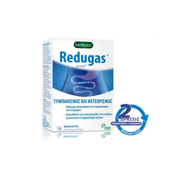 Το Redugas™ έχει μοναδική διπλή δράση αφού ανακουφίζει άμεσα από το φούσκωμα ενώ ταυτόχρονα προλαμβάνει την επανασσυσώρευση αερίων.