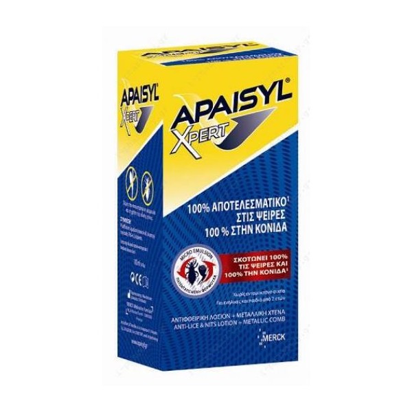 Το Apaisyl Xpert, είναι μια δραστική λοσιόν αγωγής που σκοτώνει 100% τις ψείρες και 100% την κόνιδα με 1 μόνο εφαρμογή, χάρη στην πατενταρισμένη φόρμουλα με μικροσφαιρίδια.Η ειδική φόρμουλα με μικροσφαιρίδια έχει μηχανική δράση που εξουδετερώνει την αντίσταση της ψείρας και εισχωρεί σε όλους τους πόρους, ακόμα και στους πιο μικρούς.Δράση στις ψείρες: Φράζει τις αναπνευστικές και απεκκριτικές οδούς της ψείρας προκαλώντας θάνατο από ασφυξία και οσμωτικό σοκ.Δράση στην κόνιδα: Τα μικροσωματίδια που εισχωρούν στις αναπνευστικές και απεκκριτικές οδούς της κόνιδας προκαλούν θάνατο από ασφυξία.Διάλυση της σπουμαλίνης (κόλλα) της κόνιδας, με αποτέλεσμα οι κόνιδες να σκοτώνονται και να απομακρύνονται εύκολα με την ειδική χτένα.Το Apaisyl Xpert αφήνει τα μαλλιά καθαρά, απαλά και ευκολοχτένιστα.Είναι εύκολο στη χρήση, δεν στάζει και ξεπλένεται εύκολα.Δοκιμασμένο υπό παιδιατρικό, δερματολογικό και οφθαλμολoγικό έλεγχο.