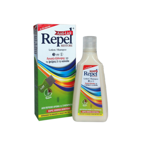 Το Repel® Anti-lice Restore αποτελείται από Lotion/Shampoo & ειδικά σχεδιασμένο χτενάκι, και απαλλάσσει αποτελεσματικά το τριχωτό της κεφαλής από τις ψείρες και τις κόνιδες. Εφαρμόζεται σε περιπτώσεις που ήδη υπάρχει διαπιστωμένη προσβολή από ψείρες.Έχει τριπλή δράση:1. Σκοτώνει ψείρες και κόνιδες μέσα σε 15 λεπτά2. Εξαλείφει και τα υπολείμματα από τις κόνιδες χάρη στο ειδικά σχεδιασμένο χτενάκι που περιέχει.3. Αφήνει τα μαλλιά καθαρά μετά από απλό ξέβγαλμαΤο Repel® Anti-lice Restore είναι προϊόν που έχει αναπτυχθεί στα εργαστήρια της Uni-pharma.Μηχανισμός δράσης:Χάρη στο μοναδικό συνδυασμό διμεθικόνης και παραγώγων ελαίου καρύδας που περιέχει, επικάθεται στις ρίζες δημιουργώντας ένα προσωρινό τεχνητό φραγμό στις αναπνευστικές οδούς των ψειρών με αποτέλεσμα την νέκρωση των οργανισμών, μέσα σε 15 λεπτά, λόγω ασφυξίας.Το Repel® Anti-lice Restore αντιμετωπίζει ολοκληρωμένα τις ψείρες με απόλυτα φυσικό/μηχανικό τρόπο. Η ειδικά μελετημένη του σύνθεση:Καταπολεμά αποτελεσματικά ψείρες και κόνιδες με μία μόνο εφαρμογή.Καθαρίζει τα μαλλιά και τα αφήνει απαλά και ευκολοχτένιστα.Δεν προάγει φαινόμενα προσαρμογής των ψειρών στην θεραπεία.Είναι δερματολογικά ελεγμένο και κατάλληλο για παιδιά άνω των 2 ετών και ενήλικες.Η συσκευασία εξασφαλίζει ιδανική ποσότητα για πολλές χρήσεις.Ιατροτεχνολογικό προϊόν.Το Repel® Anti-lice Restore, όπως όλα τα προϊόντα της σειράς Repel, δεν περιέχει χημικά βιοκτόνα, αρώματα, parabens, και είναι δερματολογικά ελεγμένο.