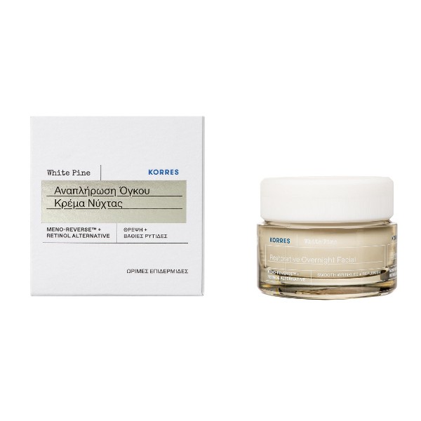Η σύνθεση της Korres White Pine Αναπλήρωση Όγκου Κρέμα Νύχτας είναι ενισχυμένη με τεχνολογία Meno-Reverse και ένα συστατικό εναλλακτικό της ρετινόλης, που μειώνει την εμφάνιση των βαθιών ρυτίδων και αναπληρώνει την ενυδάτωση του δέρματος κατά τη διάρκεια της νύχτας, θρέφοντας την εύθραυστη και λεπτή επιδερμίδα.