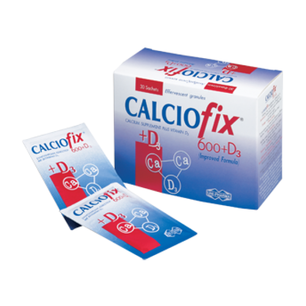 Tα CALCIOFIX sachets είναι αναβράζοντα κοκκία κιτρικού ασβεστίου & βιταμίνης D3 για μέγιστη απορρόφηση  ακόμα και όταν δεν υπάρχει η κατάλληλη οξύτητα στο στομάχι εξαιτίας αχλωρυδρίας ,αυξημένου pH, λήψης φαρμάκων ή λόγω γήρανσης.Για την κάλυψη των αναγκών σε ασβέστιο και βιταμίνη D3 κατά τη διάρκεια της εγκυμοσύνης, του θηλασμού, την πρόληψη και αντιμετώπιση της οστεοπόρωσης καθώς και σε όποια άλλη περίοδο της ζωής της γυναίκας υπάρχουν αυξημένες απαιτήσεις σε ασβέστιο & βιταμίνη D.ΕΝΔΕΙΞΕΙΣ• Εγκυμοσύνη• Θηλασμός• ΟστεοπόρωσηΧωρίς τον κίνδυνο εμφάνισης δυσπεπτικών ενοχλήσεωνΚατάλληλο και για διαβητικές ασθενείς.Με 600mg ασβεστίου (κιτρικό ασβέστιο) + 200IU D3 (χοληκαλσιφερόλη)Με γεύση λεμόνιΧωρίς γλυκαντικές ουσίες