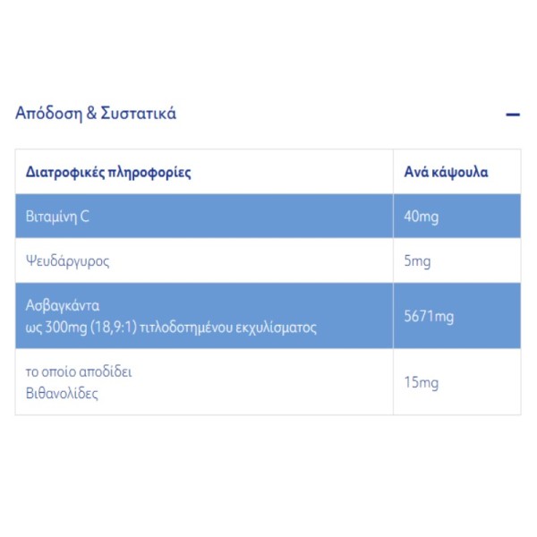 Το Ashwagandha Advance της Lamberts® αποτελεί ένα υψηλής ισχύος τιτλοδοτημένο εκχύλισμα ρίζας Ασβαγκάντας. To σύνολο του βοτάνου που χρησιμοποιείται στην παρασκευή του Ashwagandha Advance, προέρχεται από την ρίζα του βοτάνου, καθώς εκεί ανευρίσκονται αποκλειστικά οι βιθανολίδες. Έτσι κάθε ταμπλέτα παρέχει ένα εγγυημένο ποσό 15mg βιθανολιδών, μια ποσότητα που ισούται αυτής που έχει χρησιμοποιηθεί στην πλειονότητα των κλινικών μελετών.