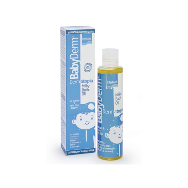 Με βρώμη και τα απαραίτητα λιπαρά οξέα Ωμέγα 6 (γ- λινολενικό) & Ωμέγα 3 (α- λινολενικό)Η BABYDERM DERMATOPIA milky bath oil σχεδιάστηκε ειδικά ώστε να καλύπτει τις ιδιαίτερες απαιτήσεις του δέρματος με έντονη ξηρότητα και ευαισθησία ως αποτέλεσμα της ατοπικής δερματίτιδας. Χάρη στη προηγμένη τεχνολογία InterTECH της InterMED, το BABYDERM DERMATOPIA milky bath oil περιέχει συστατικά που έχουν μελετηθεί ως προς την ικανότητά τους να σφραγίζουν την απαραίτητη υγρασία στις βαθύτερες στοιβάδες τις επιδερμίδας κατά τη διαδικασία του καθημερινού μπάνιου, αφήνοντας το δέρμα απαλό και ελαστικό ενώ παράλληλα να ανακουφίζουν από ερεθισμούς & φλεγμονές.ΕΝΔΕΙΞΕΙΣ Εντατική ενυδάτωση της επιδερμίδας κατά τη διαδικασία του καθημερινού μπάνιου Κατάλληλο σε περιόδους έξαρσης των συμπτωμάτων της ατοπικής δερματίτιδαςΕμπλουτισμένο με εκχυλίσματα βοτάνων και δερμοπροστατευτικών βιταμινώνΔεν περιέχει parabens, τεχνητά χρώματα, σαπούνι, SLS, SLES