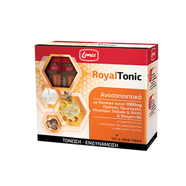 Το Royal Tonic είναι ένα εξειδικευμένο συμπλήρωμα διατροφής που συνδυάζει βασιλικό πολτό και πρόπολη, γνωστά για την τόνωση και θωράκιση του οργανισμού με άλλα θρεπτικά συστατικά. Ο βασιλικός πολτός, η πλέον γνωστή «υπερτροφή», δικαίως θεωρείται «ελιξήριο υγείας και νεότητας» καθώς είναι ιδιαίτερα ωφέλιμος για την ενδυνάμωση του οργανισμού. Το colostrum (πρωτόγαλα), μια εξίσου εξαιρετική φυσική τροφή, είναι το πρώτο γάλα των θηλαστικών που προσφέρουν στα νεογνά τους κατά τις πρώτες 2436 ώρες αμέσως μετά τη γέννησή τους. Το πρωτόγαλα είναι ιδιαίτερα πλούσιο σε θρεπτικές ουσίες με όλα τα αντισώματα που χρειάζεται να δυναμώσει ο οργανισμός των νεογνών και να ενισχυθεί το ανοσοποιητικό τους σύστημα. Έρευνες αποδεικνύουν ότι το πρωτόγαλα είναι πλούσια πηγή πρωτεϊνών, αυξητικών παραγόντων, βιταμινών, μετάλλων, υδατανθράκων και άλλων βιοενεργών παραγόντων με θετική επίδραση στην ανοσοποιητική ενδυνάμωση και ευεργετικά οφέλη για τον οργανισμό, όχι μόνο για τα νεογνά αλλά και κατά τη διάρκεια όλης της ζωής. Με μανιτάρια οργανικής καλλιέργειας reishi & shiitake, πλούσια σε φυσικά θρεπτικά συστατικά που αναζωογονούν και τονώνουν τον οργανισμό. Το μανιτάρι reishi είναι γνωστό ως «το ελιξίριο της ζωής» λόγω των αντιγηραντικών ιδιοτήτων. Τα μανιτάρια reishi & shiitake χάρη στην υψηλή περιεκτικότητα σε πολυσακχαρίτες-β-γλυκάνες αναζωογονούν τον οργανισμό και ενισχύουν τις φυσικές άμυνες. Επιπλέον η βιταμίνη Β6 συμβάλλει στη φυσιολογική λειτουργία του ανοσοποιητικού και νευρικού συστήματος, καθώς και στη ρύθμιση της ορμονικής δραστηριότητας, στη φυσιολογική ψυχολογική λειτουργία και στη μείωση της κούρασης και κόπωσης.Ενδυναμώνει το ανοσοποιητικό και ενισχύει την αντιμετώπιση του κρυολογήματος και της γρίπης, ενώ βοηθά στην πρόληψη των ασθενειών του ανώτερου αναπνευστικού συστήματος, όπως το «κοινό κρυολόγημα».Συνιστάται σε:Είναι ιδανικό σε περιόδους που επίκειται εξασθένηση του ανοσοποιητικού συστήματος (γρίπη, κρυολόγημα) ή χαμηλή άμυνα συμβάλλοντας στην ενίσχυση της ανθεκτικότητας του οργανισμού για την προστασία του από μικρόβια. Χάρη στην αποκλειστική σύστασή του, είναι ιδανικό επίσης σε περιόδους ανάρρωσης από την επίδραση εξωτερικών παραγόντων που αποδυναμώνουν τον οργανισμό.