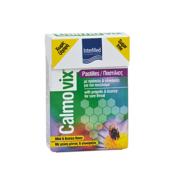 Οι παστίλιες Calmovix μαλακώνουν τον πονεμένο λαιμό, χάρη στην ευεργετική δράση της πρόπολης και της γλυκόριζας.Mε γεύση μέντας & γλυκόριζαςΧωρίς ζάχαρη