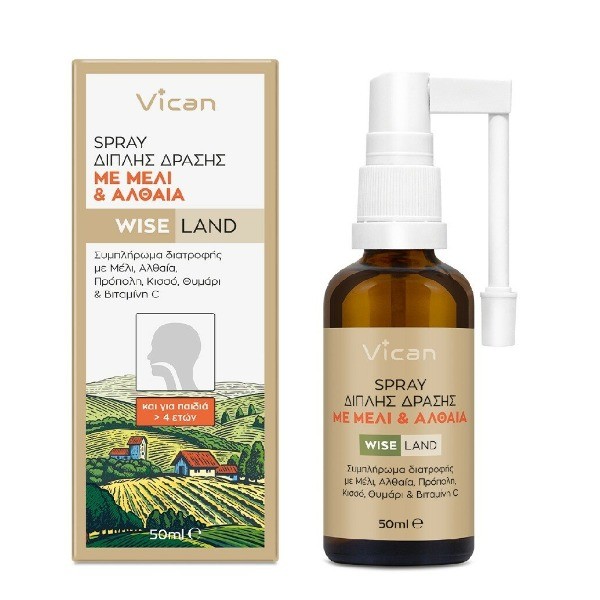 Φυσικό spray βοτάνων με διπλή δράση που μαλακώνει το λαιμό, ενώ ταυτόχρονα συμβάλλει στη φυσιολογική λειτουργία του ανοσοποιητικού. Το Wise Land Spray διπλής δράσης περιέχει προσεκτικά επιλεγμένα βότανα ελληνικής γης (αλθαία, κισσός, θυμάρι), παραδοσιακά συστατικά (μέλι, πρόπολη) και βιταμίνες (Βιταμίνη C), που δημιουργούν έναν υπέροχο δραστικό συνδυασμό, ο οποίος βοηθάει στην καλή υγεία του οργανισμού.