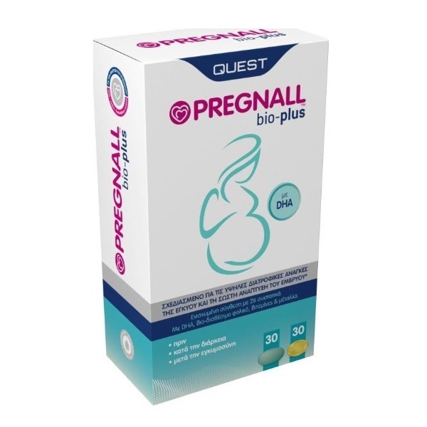 Το συμπλήρωμα διατροφής Pregnall bio-plus της Quest είναι μια διπλή συσκευασία που συνδυάζει τις αυθεντικές πολυθρεπτικές ταμπλέτες Pregnall bio-grow και DHA κάψουλες, προσφέροντας ενισχυμένη διατροφική υποστήριξη στη μέλλουσα μητέρα καθ όλη τη διάρκεια της εγκυμοσύνης.