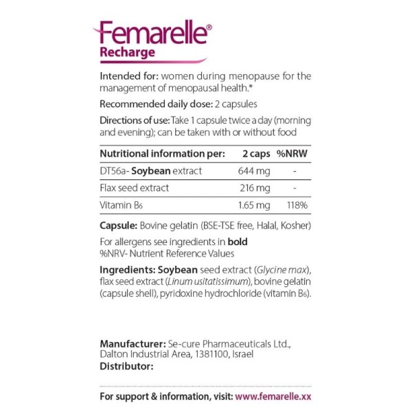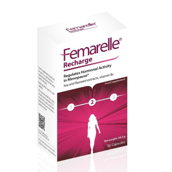 Το Femarelle® Recharge συνδυάζει το αποκλειστικό και επιστημονικά τεκμηριωμένο εκχύλισμα σόγιας DT56a με βιταμίνη Β6 και λιναρόσπορο, προσφέροντας καθημερινή διατροφική υποστήριξη για τη γυναίκα κατά τη φυσιολογική μετάβαση στην εμμηνόπαυση. Η σύνθεσή του είναι 100% φυσικής προέλευσης και χωρίς ορμόνες.