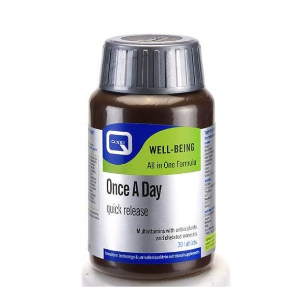 Το συμπλήρωμα διατροφής Once A Day της Quest σχεδιάστηκε για όσους θέλουν να διατηρήσουν μια βέλτιστη υγεία και καλή φυσική κατάσταση. Επίσης, αποτρέπει τη συσχετιζόμενη με τον τρόπο ζωής ανεπάρκεια των απαραίτητων θρεπτικών συστατικών, προστατεύει τα κύτταρα από οξειδωτική βλάβη που προκαλείται από τοξίνες και από το περιβάλλον, προσφέρει ενέργεια και ζωντάνια, ελαττώνοντας την κόπωση, ενισχύει την απόκριση του ανοσοποιητικού συστήματος και υποστηρίζει την αυτοσυγκέντρωση και τη μνήμη. Ιδανικό συμπλήρωμα για άτομα ηλικίας άνω των 50 ετών. 30 Ταμπλέτες Αυτό το προϊόν περιέχει σίδηρο ο οποίος, αν ληφθεί υπερβολικά, μπορεί να είναι επιβλαβής για πολύ μικρά παιδιά. Κρατήστε το μακριά από αυτά.