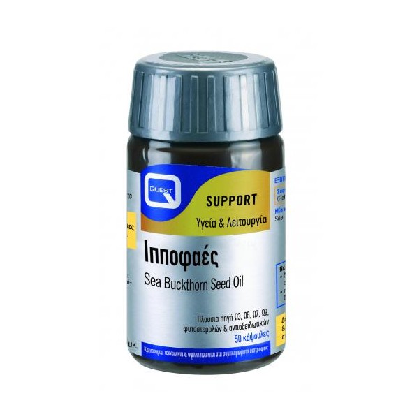 Το Ιπποφαές της Quest παρέχει 500mg ελαίου σπόρων του φυτού Ιπποφαές ανά κάψουλα. Το Ιπποφαές προσφέρει στον οργανισμό εύρος θρεπτικών συστατικών όπως βιταμίνες, ισχυρά αντιοξειδωτικά, απαραίτητα λιπαρά οξέα (ωμέγα-3, ωμέγα-6, ωμέγα-7 & ωμέγα-9), φλαβονοειδή, καροτενοειδή, ιχνοστοιχεία και φυτοστερόλες. Η ποικιλία αυτή των συστατικών είναι ιδιαίτερα ωφέλιμη για την υγεία του καρδιαγγειακού συστήματος και την υγεία του δέρματος. Επίσης, τα συστατικά αυτά μπορούν να συμβάλλουν στην αντιμετώπιση στομαχικών ελκών και γενικότερα στην υγεία του γαστρεντερικού και να ενισχύσουν την υγεία του ήπατος και του ανοσοποιητικού.