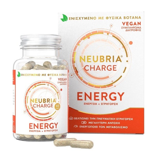Το Neubria Charge είναι σχεδιασμένο ειδικά για άτομα που επιθυμούν να μειώσουν την κούραση και να αυξήσουν την πνευματική και σωματική τους απόδοση, χωρίς τις ανεπιθύμητες δράσεις της καφεΐνης. Περιέχει το μείγμα βοτάνων "Charge up" με εξειδικευμένα βότανα για συνεχή απελευθέρωση ενέργειας από εντελώς φυσικές διεγερτικές ουσίες.
