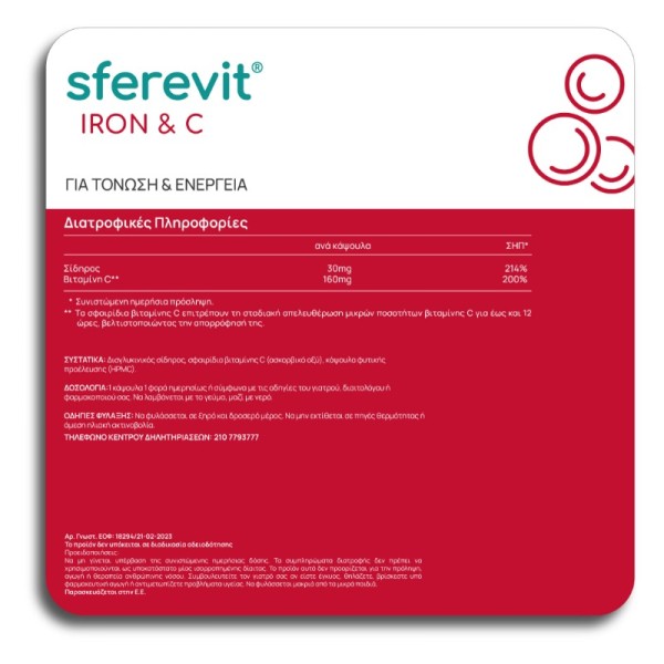 Τοsferevit IRON & Cπεριέχει 30mg δισγλυκινικού σιδήρου υψηλής βιοδιαθεσιμότητας και 160mg βιταμίνης C σε σφαιρίδια αργής αποδέσμευσης.