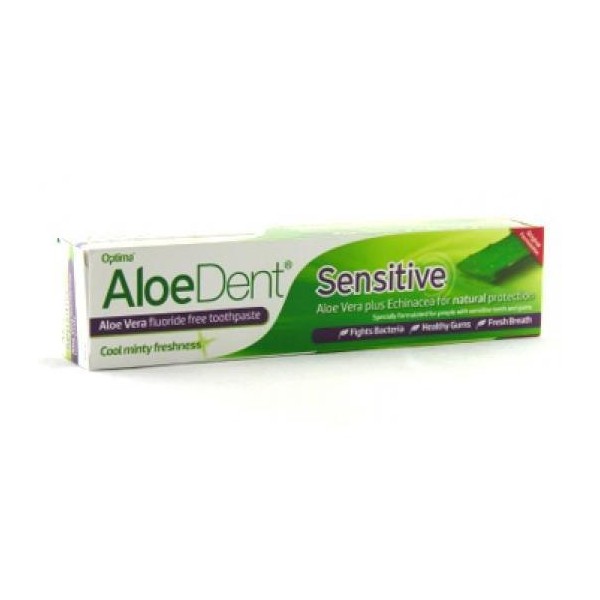 Οι οδοντόκρεμες Aλόης αποτελούν μια καινοτομία στον τομέα της στοματικής υγιεινής και προστασίας της στοματικής κοιλότητας από τερηδόνα και από διάφορες παθήσεις των ούλων. Αντίθετα με τις περισσότερες οδοντόκρεμες δεν περιέχουν νερό αλλά φυσική Αλόη, η οποία σε συνδυασμό με ένα αποτελεσματικό συνδυασμό φυσικών συστατικών παρέχει άμεση, φυσική προστασία από πλάκα, ουλίτιδα και τερηδόνα και παράλληλα δίνει μια υπέροχη αίσθηση δροσιάς και λευκό χαμόγελο καταπολεμώντας τη δυσοσμία και τις οδοντικές κηλίδες.Η Aloe Dent Sensitive Toothpaste περιέχει μαλακτικό ζελέ φυσικής αλόης με ανακουφιστική δράση, πράσινο τσάι – κατά των βακτηρίων, έλαιο τεϊόδεντρου για αντισηπτική δράση, συνένζυμο Q10 για υγιή ούλα, πυρίτιο για φυσική λεύκανση των δοντιών, χαμομήλι για ανακουφιστική δράση και μενθόλη για φυσική γεύση μέντας. Παράλληλα δεν περιέχει φθόριο.H Aloe Dent Sensitive Toothpaste παρέχει φυσική προστασία για ευαίσθητα ούλα και δόντια. Με 2 μόνο βουρτσίσματα την ημέρα με Αloe Vera Sensitive της σειράς Aloe Dent, βοηθάτε στην καταπολέμηση της οδοντικής πλάκας, της ουλίτιδας, της τερηδόνας και της δυσοσμίας του στόματός σας ενώ παράλληλα θωρακίζετε την στοματική σας υγιεινή ενάντια σε ασθένειες των δοντιών και των ούλων, πάντα με έξτρα φροντίδα λόγω της καταπραυντικής δράσης του χαμομηλιού.