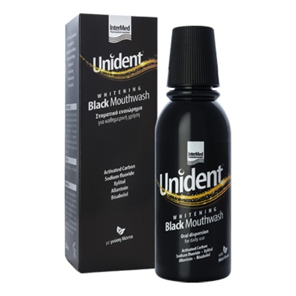 Το Intermed Unident Whitening Black Mouthwash είναι ένα στοματικό διάλυμα με φυσική λευκαντική δράση,