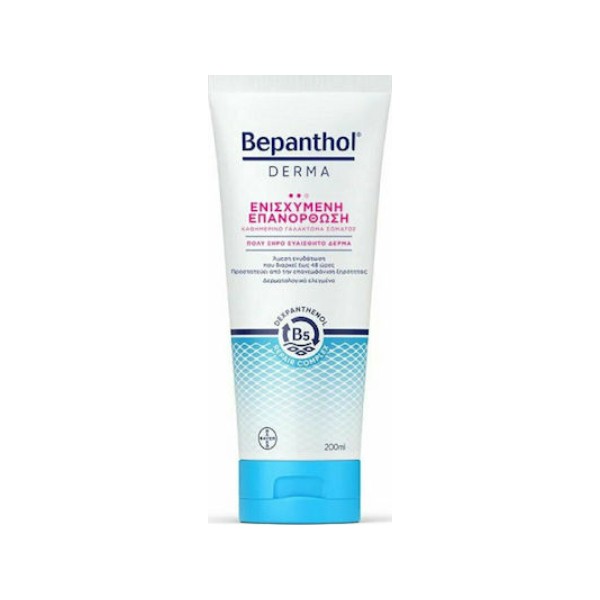 - Το Bepanthol Derma Καθημερινό Γαλάκτωμα Σώματος για Ενισχυμένη Επανόρθωση έχει μια ειδική σύνθεση που παρέχει άμεση ενυδάτωση που διαρκεί έως 48 ώρες, προστατεύοντας από την επανεμφάνιση της ξηρότητας.