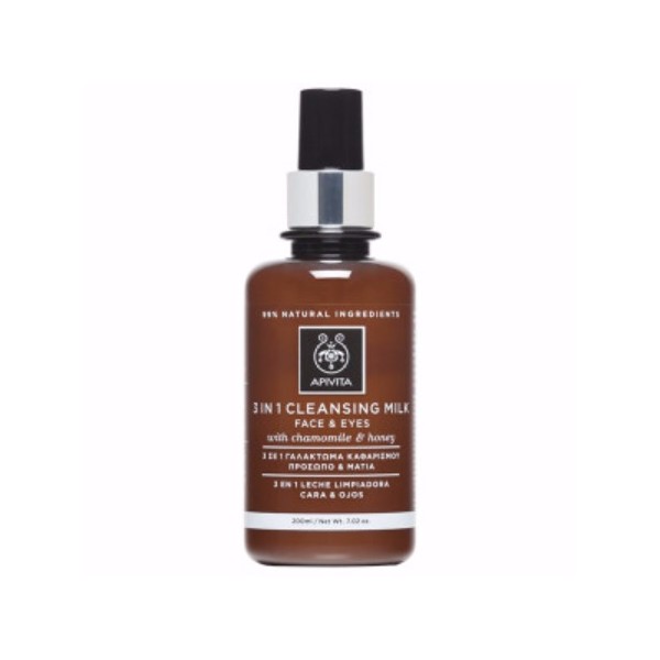 Πρακτικό γαλάκτωμα καθαρισμού 3σε1 που απομακρύνει απαλά ρύπους και μακιγιάζ από πρόσωπο και μάτια ενώ παράλληλα προσφέρει ενυδάτωση, αφήνοντας την επιδερμίδα απαλή και αναζωογονημένη. Το βιολογικό έλαιο ελιάς και το έλαιο αμυγδάλου απομακρύνουν ρύπους και μακιγιάζ ενώ παρέχουν στην επιδερμίδα βιταμίνες και λιπίδια. Το βιολογικό μέλι ενυδατώνει και θρέφει την επιδερμίδα. Το βιολογικό χαμομήλι και η βιολογική λεβάντα καταπραΰνουν την επιδερμίδα και προστατεύουν από ερεθισμούς. Η πρόπολη προσφέρει ήπια αντισηπτική δράση και αντιοξειδωτική προστασία. Κατάλληλο για όλους τους τύπους επιδερμίδας.Η APIVITA αντικαθιστά το νερό με έγχυμα από βιολογικό πράσινο τσάι για την ισχυρή αντιοξειδωτική του δράση.ΔΕΡΜΑΤΟΛΟΓΙΚΑ ΕΛΕΓΜΕΝΟΟΦΘΑΛΜΟΛΟΓΙΚΑ ΕΛΕΓΜΕΝΟ99% φυσική σύνθεση