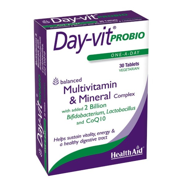 Ολοκληρωμένος συνδυασμός βιταμινών, μετάλλων, αμινοξέων, πεπτικών ενζύμων, CoQ10 & 2 δις προβιοτικών, που εξασφαλίζει στον οργανισμό ενέργεια και παράλληλα συντελεί στην ομαλή λειτουργία της πέψης, του εντέρου και του ανοσοποιητικού συστήματος. Η προσθήκη στην σύνθεση 2 δισεκατομμυρίων προβιοτικών (4 διαφορετικά στελέχη), βοηθά στην ισορροπία της εντερικής χλωρίδας, που είναι απαραίτητη για την αφομοίωση θρεπτικών συστατικών από τις τροφές και εμποδίζει την ανάπτυξη παθογόνων βακτηρίων, ενώ τα πεπτικά ένζυμα (πηκτίνη μήλου, παπαϊνη, βρωμελίνη) καθιστούν την Day-vit Probio την πιο αφομιώσιμη πολυβιταμίνη, χωρίς να επιβαρύνει καθόλου το στομάχι.