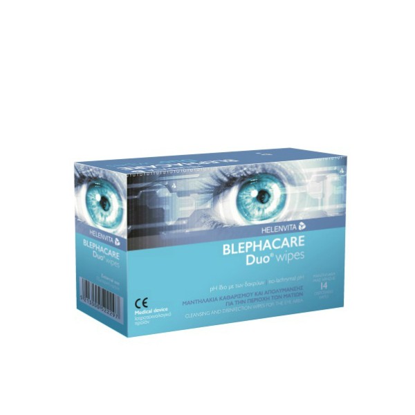 Τα μαντηλάκια HELENVITA BLEPHACARE Duo είναι ένα καινοτόμο προϊόν εμποτισμένο με διάλυμα ειδικά σχεδιασμένο για τον καθημερινό καθαρισμό των βλεφάρων και των βλεφαρίδων με εκκρίσεις.Είναι υποαλλεργικά ελεγμένο, με pH ίδιο με των δακρύων, ρυθμίζει το βακτηριακό φορτίο και είναι κατάλληλο για τον καθημερινό καθαρισμό της περιοχής των ματιών.Iδιότητες: Τα μαντηλάκια HELENVITA BLEPHACARE Duo δεν περιέχουν αρώματα που μπορεί να προκαλέσουν αλλεργικές αντιδράσεις σε ευαίσθητα άτομα, προσφέρουν απαλό καθαρισμό και απομάκρυνση των βλεννωδών εκκρίσεων, της απολέπισης στα βλεφαρικά χείλη με τη μορφή πιτυρίδας και των λιπωδών ή κηρωδών κρουστών.Το προϊόν επιτρέπει έναν απαλό και αναζωογονητικό καθαρισμό, καθώς και τη ρύθμιση του βακτηριακού φορτίου, που προοδευτικά εμποδίζει το δημιουργία εκκρίσεων. Τα μαντηλάκια HELENVITA BLEPHACARE Duo μπορούν να χρησιμοποιηθούν σε ενήλικες και παιδιά.