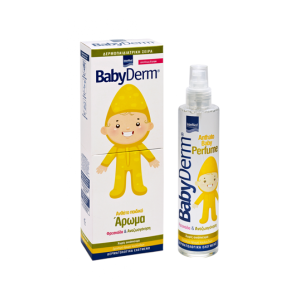Το Babyderm Anthato Baby Parfum είναι απαλό αρωματικό υγρό χωρίς οινόπνευμα για απόσμηση, τόνωση και αναζωογόνηση του βρεφικού και παιδικού δέρματος, δίχως τον κίνδυνο εμφάνισης  ερεθισμού ή ξηρότητας.ΕΝΔΕΙΞΕΙΣΑπόσμηση, τόνωση & αναζωογόνηση του βρεφικού και παιδικού δέρματος.Με φυσικό άρωμα λουλουδιών, εκχύλισμα δερμοκοσμητικών βοτάνων (νεράτζι, χαμομήλι, μολόχα) και πρωτεΐνες ρυζιού. Δεν περιέχει χρώματα και ερεθιστικά αρώματα.Δερματολογικά ελεγμένο με φυσιολογικό pH.