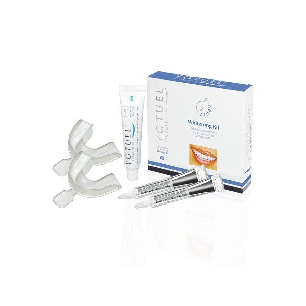 To σύστημα λεύκανσης δοντιών στο σπίτι YOTUEL 7 hours είναι σχεδιασμένο από οδοντιάτρους, για εύκολη εφαρμογή στο σπίτι.Λευκαίνει τα δόντια με το λευκαντικό παράγοντα Carbamide Peroxide (0,3%) συστατικό που χρησιμοποιούν οι οδοντίατροι στα μασελάκια λεύκανσης δοντιών.Είναι εύκολο και άνετο στη χρήση και προσφέρει έως 8 τόνους πιο λευκά δόντια σε 7 μόνο εφαρμογές! Για πιο εντυπωσιακά αποτελέσματα, προτείνεται οι εφαρμογές να γίνονται διαδοχικά σε διάστημα 1 εβδομάδας.Περιλαμβάνει 7 εφαρμογές της 1 ώρας με ευπροσάρμοστα στη γνάθο μασελάκια λεύκανσης δοντιών, για μεγαλύτερη άνεση.Καθαρίζει χρωματικούς λεκέδες & βαθιές δυσχρωμίες στα δόντια.Η λεύκανση γίνεται τόσο στη μπροστινή όσο και στην πίσω όψη των δοντιώνΚαθαρίζει και ταυτόχρονα προστατεύει το σμάλτο με φθοριούχο κάλιο (1470ppmF-) και ξυλιτόλη, χωρίς να προκαλεί ευαισθησία.Λευκαίνει τα δόντια με ασφάλεια καθώς δεν περιέχει χημικές ή διαβρωτικές ουσίες.Η συσκευασία περιλαμβάνει: 2 σωληνάρια Gel λεύκανσης δοντιών στο σπίτι YOTUEL 7 hours Gel 6ml 1 σωληνάριο λευκαντική οδοντόκρεμα YOTUEL classic mint 25ml 2 εύκαμπτα μασελάκια λεύκανσης δοντιών