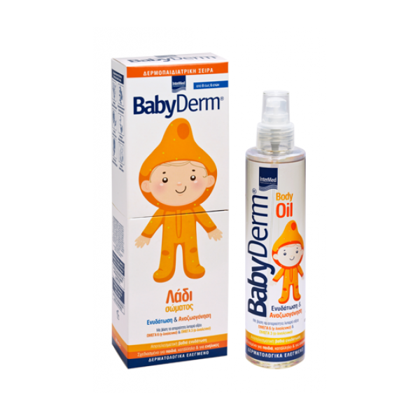 Το Babyderm Body oil είναι λάδι σώματος για βαθιά ενυδάτωση, ανακούφιση και προστασία του ξηρού και ταλαιπωρημένου βρεφικού και παιδικού δέρματος.ΕΝΔΕΙΞΕΙΣΞηρό & ταλαιπωρημένο δέρμα.Με βάση τα απαραίτητα Ω3 & Ω6 λιπαρά οξέα, εκχυλίσματα δερμοκοσμητικών βοτάνων (βοράγινο, χαμομήλι, ηλίανθο, αγριοτριανταφυλλιά, καλεντούλα, βρώμη, λεκιθίνη) και δερμοπροστατευτικές βιταμίνες (βιταμίνη Ε).Χωρίς χρώματα και ερεθιστικά αρώματα.Δερματολογικά ελεγμένο με φυσιολογικό pH.