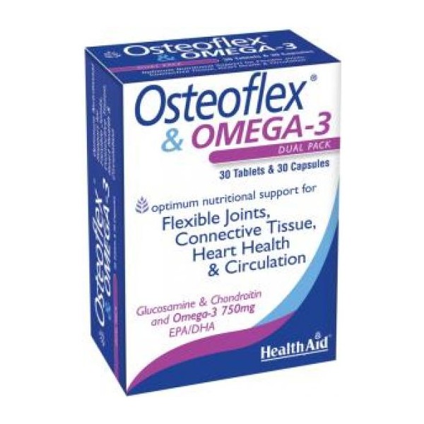30 κάψουλες Omega-3: Απαραίτητα λιπαρά οξέα πλούσια σε ΕΡΑ(425mg) & DHA(325mg), που βοηθούν στην καλή λειτουργία του κυκλοφορικού και της καρδιάς. Επίσης ελαττώνουν την παραγωγή προσταγλανδινών από τον οργανισμό, οι οποίες είναι υπεύθυνες για την έκφραση της φλεγμονής και με αυτόν τον τρόπο μειώνουν το αίσθημα του πόνου. Η παράλληλη λήψη Ωμέγα -3 με Osteoflex είναι ιδανική για την μείωση φλεγμονών, ακαμψίας & του πόνου της οστεοαρθρίτιδας. Η διπλή σύνθεση δρα συνεργιστικά για την υγεία των αρθρώσεων και των συνδέσμων, βελτιώνοντας ταυτόχρονα την υγεία της καρδιάς και του κυκλοφορικού.