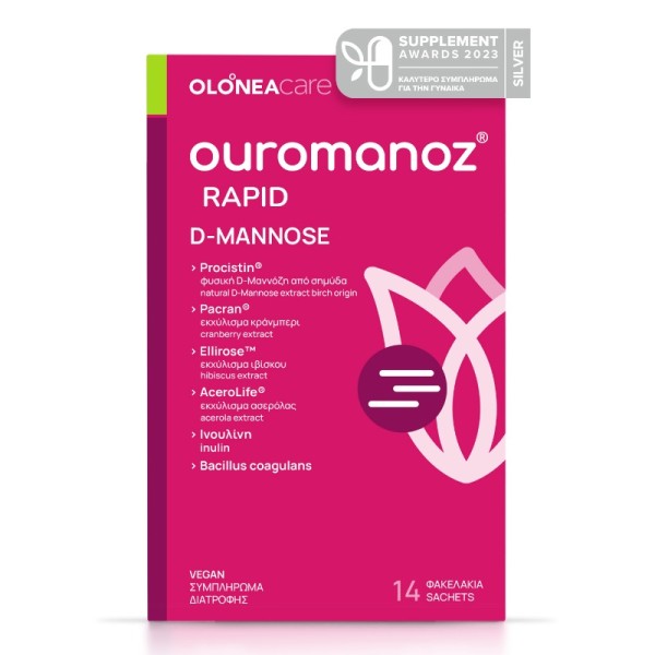 Καινοτόμο συμπλήρωμα διατροφής με φυσική D-μαννόζη από φλοιό σημύδα, cranberry PACRAN®, ιβίσκο sabdariffa-Roselle Ellirose™, προβιοτικά Bacillus coagulans, πρεβιοτική ινουλίνη και βιταμίνη C από ασερόλα.
