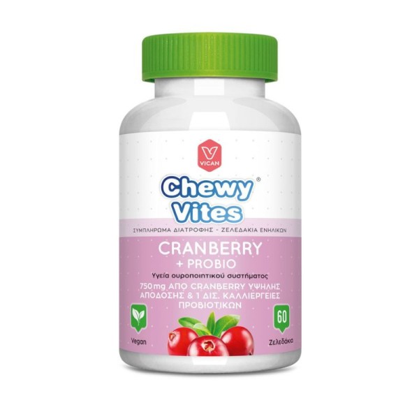 Τα Chewy Vites Cranberry + Probio περιέχουν έναν συνδυασμό εκχυλίσματος cranberry (πλούσιο σε βιταμίνη C), που προέρχεται από καρπούς* υψηλής απόδοσης, μαζί με δύο επιστημονικά ελεγμένα βακτηριδιακά στελέχη. Κάθε μερίδα (2 ζελεδάκια) περιέχει 750 mg καθαρού συμπυκνώματος cranberry (αναλογίας 3,4:1 που αντιστοιχεί σε 2.550 mg καρπών cranberries/μερίδα), το οποίο είναι ευεργετικό για την υποστήριξη της υγείας του ουροποιητικού συστήματος. Κάθε μερίδα περιέχει 1 δισεκατομμύριο στελέχη προβιοτικών (Bifidobacterium infantis και Lactobacillus rhamnosus) που ενισχύουν την ημερήσια πρόσληψη σε ωφέλιμες καλλιέργειες και συμβάλλουν στην ενίσχυση της φυσικής μικροχλωρίδας του οργανισμού.