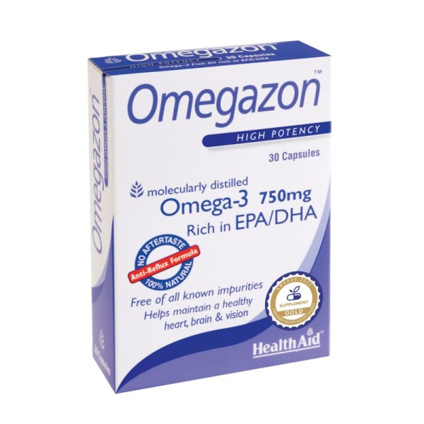 Το Omegazon της HealthAid είναι ειδικά παρασκευασμένο από Νορβηγικά ιχθυέλαια διπλής μοριακής απόσταξης, απαλλαγμένα από διοξίνες, προσμίξεις ή βαρέα μέταλλα, ώστε ν’αποδίδει πλήρη συγκέντρωση ωφέλιμων λιπαρών οξέων EPA/DHA στην ελεύθερη & πιο καθαρή μορφή τους. Μοναδική Anti-Reflux σύνθεση, η οποία δεν αφήνει επίγευση ψαριού. Ιδανικό σε περιπτώσεις υπερτριγλυκεριδαιμίας, έλεγχο χοληστερίνης & αρτηριακής πίεσης καθώς και για φλεγμονώδεις καταστάσεις (αρθρώσεις).