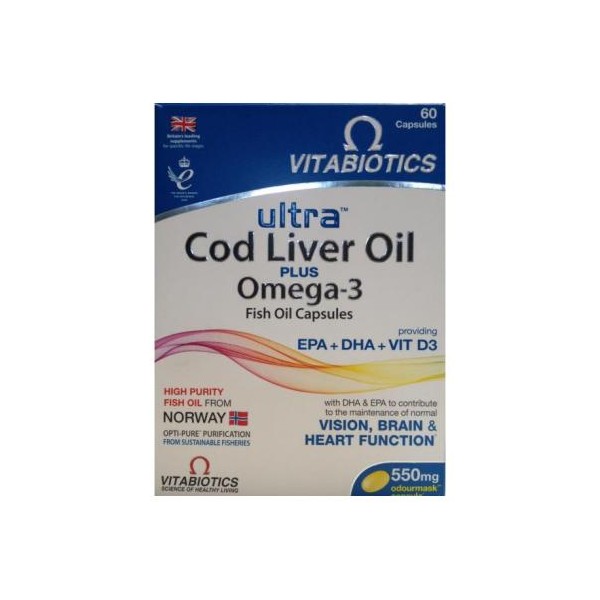 Το συμπλήρωμα διατροφής Ultra 2 in 1 Cod Liver Oil Capsules της Vitabiotics είναι μια μοναδική σύνθεση με ωμέγα-3 ιχθυέλαιο και μουρουνέλαιο σε αναλογία 1:1. Τα ωμέγα-3 ιχθυέλαια αποτελούν μια πλούσια πηγή των ωμέγα-3 απαραίτητων λιπαρών οξέων DHA και EPA, ενώ το μουρουνέλαιο εκτός από ωμέγα-3 λιπαρά οξέα, παρέχει μεγάλες ποσότητες φυσικών βιταμινών D και Α. Τα ωμέγα-3 λιπαρά οξέα έχουν σύμφωνα με πολυάριθμες μελέτες πολλαπλά οφέλη σε πολλούς τομείς της ανθρώπινης υγείας. Έχει αποδειχθεί ότι τα ωμέγα-3 συμβάλλουν στη ρύθμιση των επιπέδων της χοληστερίνης και των τριγλυκεριδίων, τη διατήρηση της ελαστικότητας των τοιχωμάτων των αρτηριών και τη φυσιολογική αρτηριακή πίεση, μπορούν επομένως να συνεισφέρουν στην υγεία της καρδιάς.Επίσης, παίζουν σημαντικό ρόλο στη λειτουργία του εγκεφάλου και επηρεάζουν τη συμπεριφορά και την ικανότητα συγκέντρωσης σε παιδιά και ενήλικες. Επιπλέον, έχει αποδειχθεί ότι τα EPA και DHA έχουν αντιφλεγμονώδη δράση και μπορούν να συμβάλλουν στην υγεία των αρθρώσεων, ενώ το DHA είναι ιδιαίτερα σημαντικό για την υγεία των οφθαλμών, ιδιαίτερα του αμφιβληστροειδούς. Η βιταμίνη D είναι απαραίτητη για την υγεία των οστών, ενώ παίζει σημαντικό ρόλο και στην υγεία του δέρματος και του ανοσοποιητικού. Η σύνθεση έχει εμπλουτιστεί με βιταμίνη Ε, αντιοξειδωτικό που υποστηρίζει σημαντικά την υγεία της καρδιάς, του ανοσοποιητικού και του δέρματος.