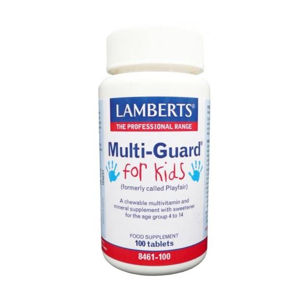 Η σωστή διατροφή είναι σημαντική για τα παιδιά, κυρίως σε περιόδους ραγδαίας ανάπτυξης ή όταν γίνεται μεγάλη κατανάλωση ενέργειας μέσω της άθλησης και άλλων δραστηριοτήτων. Δυστυχώς σε αυτή την ηλικία πολλά παιδιά εμφανίζουν συγκεκριμένες διατροφικές προτιμήσεις σε συνδυασμό με διατροφικά πρότυπα της εποχής έχουν ως αποτέλεσμα την ανεπαρκή πρόσληψη θρεπτικών συστατικών.. Το Multi-Guard For Kids αποτελεί μια από τις καλύτερες πολυβιταμινούχες φόρμουλες για παιδιά . Κάποια προϊόντα της αγοράς παρέχουν μόνο βιταμίνες και ένα ή δυο μέταλλα. Το προϊόν μας παρέχει χρήσιμα επίπεδα όλων των σημαντικών βιταμινών και μετάλλων. Αυτή η μασώμενη φόρμουλα δεν έχει προσθήκη ζάχαρης και έτσι δεν προκαλεί τερηδόνα.Μπορεί να ληφθεί μαζί με το Chewable Calcium και τη Vitamin C powder.Ταμπλετοποίση με:Sweetener: Xylitol, Fructo-oligosaccharides, Flavouring, Citric Acid, Stearic Acid, Silicon Dioxide,Magnesium Stearate, Colour: Beetroot Powder, Silicon Dioxide*.*Μικροκάψουλες με μόνο και δι- γλυκερίδια λιπαρών οξέων για να καλύψουν τη γεύση των πράσινων βιταμινών/μετάλλων.Κατάλληλο για χορτοφάγους.Αλλεργίες: Καμία .Προφυλάξεις:Μπορεί να προκληθεί κίτρινος χρωματισμός των ούρων. Αυτό είναι αβλαβές και υποδεικνύει ότι το σώμα αποβάλλει την περίσσια ποσότητα της βιταμίνης Β2 (riboflavin).Αυτό το προϊόν περιέχει σίδηρο, του οποίου αν γίνει κατάχρηση, μπορεί να είναι βλαβερό για τα μικρά παιδιά. Φυλάξτε τα σε σημείο ασφαλές από τα παιδιά.Κατάχρηση μπορεί να προκαλέσει συμπτώματα δυσκοιλιότητας.Φύλαξη:Να φυλάσσεται σε δροσερό και ξηρό περιβάλλον και να προφυλάσσεται απτό φως.