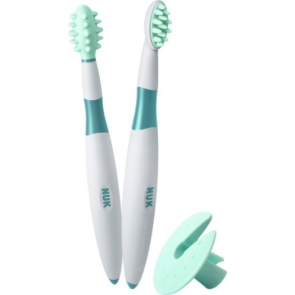 Σετ 2 τεμαχίων και προστατευτικός δακτύλιοςNUK εκπαιδευτικό βοήθημα οδοντοφυΐας, που λειτουργεί ως μασητικό και παράλληλα κάνει μασάζ σε συγκεκριμένα σημεία ανακουφίζοντας τον πόνο της οδοντοφυΐαςNUK εκπαιδευτικό βοήθημα βουρτσίσματος, για τον απαλό καθαρισμό των πρώτων δοντιώνΜε αντιολισθητική λαβή ασφαλείας και προστατευτικό δακτύλιο που δεν επιτρέπει στη βούρτσα να εισχωρήσει πολύ βαθιά στο στόμα του μωρού