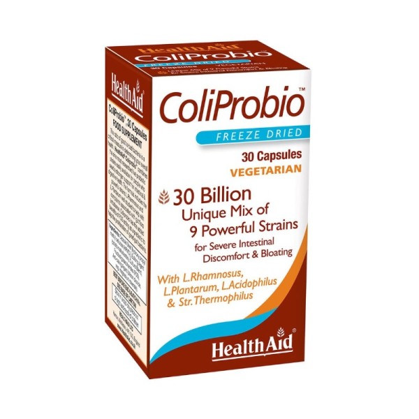 Το ColiProbio της HealthAid αποτελεί μοναδικό πολυστελεχικό συνδυασμό από 9 διαφορετικά προβιοτικά στελέχη (5 είδη Lactobacillus – 3 είδη Bifidobacterium – 1 είδος Streptococcus), μαζί με πρεβιοτικά (FOS), σε ποσότητα 30 δισεκατομμυρίων/κάψουλα.