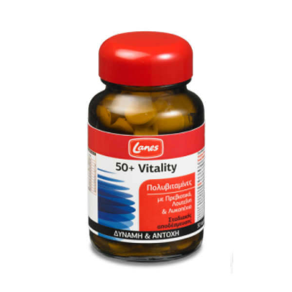 Η πολυβιταμίνη Vitality 50+ προσφέρει έναν καινοτόμο συνδυασμό βιταμινών &μετάλλων ενισχυμένο με έξτρα συστατικά και είναι ειδικά σχεδιασμένη για τις αυξημένεςανάγκες των ατόμων άνω των 50 ετών. Η πλήρης και ισορροπημένη σύνθεσή του αναπληρώνει διατροφικές ελλείψεις και συμβάλλει στη διατήρηση της φυσιολογικής λειτουργίας του οργανισμού ενισχύοντας το αμυντικό σύστημα και προσφέροντας ενέργεια, ζωτικότητα και αντοχή. Χάρη στις φυτικές ίνες ινουλίνης (πρεβιοτικά)μεγιστοποιείται η απορρόφηση των θρεπτικών συστατικών από τον οργανισμό, ενώ η προσθήκη τηςλουτεΐνης και του λυκοπένιου που έχουν ισχυρή αντιοξειδωτική δράση, συμβάλλουν στηναδρανοποίηση των ελεύθερων ριζών.• Βιταμίνες του συμπλέγματος Β, C, σίδηρο, φώσφορο, ασβέστιο & μαγνήσιο που συμβάλλουν στο μεταβολισμό για παραγωγή ενέργειας & τη μείωση της κούρασης.• Βιταμίνες Α, C, D, B6, B12, φολικό οξύ, σελήνιο, ψευδάργυρο, χαλκό & σίδηρο που βοηθούν στηφυσιολογική λειτουργία του ανοσοποιητικού.• Ασβέστιο, μαγνήσιο & βιταμίνη D που συμβάλλουν στη φυσιολογική κατάσταση των οστών & μυών.• Σίδηρο και ψευδάργυρο που συμβάλλουν στη φυσιολογική γνωσιακή λειτουργία.• Μαγνήσιο, χαλκό και βιταμίνες Β & C για τη φυσιολογική λειτουργία του νευρικού συστήματος.• Βιταμίνη Β5 που συμβάλλει στη νοητική επίδοση και βιταμίνες Β1, Β3, Β6, Β12 & φολικό οξύπου συμβάλλουν στη φυσιολογική ψυχολογική λειτουργία.• Σελήνιο & ψευδάργυρο που συμβάλλουν στη διατήρηση της φυσιολογικής κατάστασης των μαλλιών & των νυχιών. Ο ψευδάργυρος συμβάλλει επίσης στη φυσιολογική γονιμότητα & αναπαραγωγή.• Βιταμίνες Α, C, Β2, βιοτίνη & ψευδάργυρο που συντελούν στη διατήρηση υγιούς δέρματος.Τα έξτρα συστατικά του είναι ιδιαίτερα αναγκαία για τις ηλικίες 50 ετών και άνω.Πρεβιοτικά – φυτικές ίνες ινουλίνης: Απαραίτητα για την ανάπτυξη των φιλικών βακτηρίων του εντέρου και επομένως για τη διατήρηση της εντερικής χλωρίδας που αποτελεί ζωτικό παράγοντα για την υγιή κατάσταση του πεπτικού συστήματος και την ενίσχυση της αμυντικής ικανότητας του οργανισμού. Εκτός από τη συμβολή τους στη γαστρεντερική λειτουργία, τα πρεβιοτικά ενισχύουν την απορρόφηση των θρεπτικών συστατικών.Η λουτεΐνη είναι μια καροτινοειδής ουσία, μοναδικό συστατικό της ωχράς κηλίδας του οφθαλμού. Πολύτιμο αντιοξειδωτικό για την υγεία των ματιών, απορροφά την ηλιακή ακτινοβολία (μπλε ορατό φως), ενεργώντας ως φίλτρο. Κλινικές μελέτες καταδεικνύουν ότι η επαρκής πρόσληψη λουτεΐνης συμβάλλει σε μειωμένο κίνδυνο εκφύλισης της ωχράς κηλίδας (AMD-Age related Macular Degeneration) & εμφάνισης καταρράκτη.Το λυκοπένιο είναι σημαντικό αντιοξειδωτικό συστατικό για την αντιμετώπιση των επιπτώσεων των ελευθέρων ριζών οξυγόνου που δημιουργούνται από εξωτερικούς παράγοντες αλλά και κατά τον μεταβολισμό των κυττάρων. Θεωρείται ότι έχει επιπλέον ιδιότητες, όπως η ευεργετική του δράση στο δέρμα και η μείωση της χοληστερόλης, λόγω του ότι παρεμποδίζει τη δράση του ενζύμου που καταλύει την παραγωγή της.