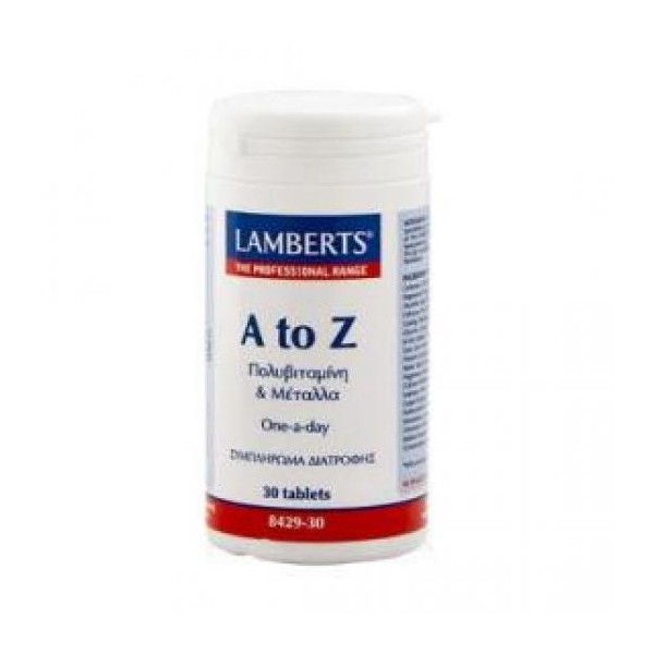 Η Α-Ζ της Lamberts είναι μια φόρμουλα μίας ταμπλέτας την ημερησίως η οποία παρέχει σχεδόν όλα τα απαραίτητα μικροθρεπτικά συστατικά, πολλά εκ των οποίων στο 100% του RDA. Αποτελεί ένα συμπλήρωμα διατροφής, το οποίο παρέχει επίπεδα μικροθρεπτικών συστατικών με στόχο τη συντήρησή τους και συνίσταται για ηλικίες άνω των 13 ετών. Παρά το γεγονός ότι η Α-Ζ παρέχει επίπεδα μικροθρεπτικών συστατικών παρόμοια με αντίστοιχες πολυβιταμινούχες φόρμουλες που κυκλοφορούν στην αγορά, έχει σημαντικά μικρότερο κόστος αγοράς.Για να διασφαλίσουμε τα σωστά επίπεδα των 2 ζωτικών για τα οστά θρεπτικών συστατικών του ασβεστίου και του μαγνησίου, οι ιατροί συχνά συστήνουν και την παράλληλη λήψη του Osteoguard.Ταμπλετοποίηση με:DiCalcium Phosphate, Cellulose, Tablet Coating (Hydroxypropyl Methylcellulose, Glycerin, Colours:Titanium Oxide & Iron Oxides), Crosslinked Cellulose Gum, Stearic Acid, Magnesium Stearate.Χρόνος αφομοίωσης: Λιγότερο από 1ώρα.Κατάλληλο για χορτοφάγους.Αλλεργίες: Καμία.Προφυλάξεις:Αυτό το προϊόν περιέχει σίδηρο, του οποίου αν γίνει κατάχρηση, μπορεί να είναι βλαβερό για τα μικρά παιδιά. Φυλάξτε τα σε σημείο ασφαλές από τα παιδιά.Φύλαξη:Να φυλάσσεται σε δροσερό και ξηρό περιβάλλον και να προφυλάσσεται απτό φως