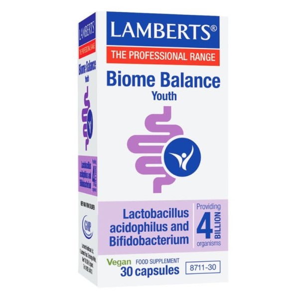 To Biome Balance Youth της Lamberts® αποτελεί ένα σκεύασμα φιλικών βακτηρίων χωρίς προσθήκη γάλακτος, που περιέχει 4 δισεκατομμύρια βακτήρια ανά κάψουλα (κατά τη στιγμή της παρασκευής).