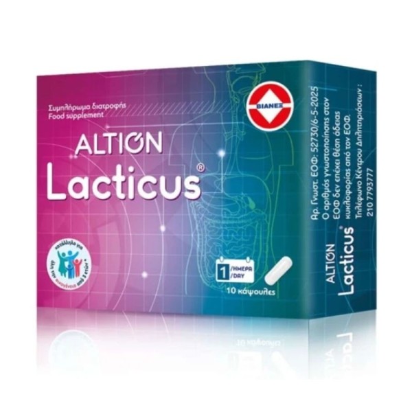 Το Altion Lacticus είναι ένα συμπλήρωμα διατροφής με προβιοτικά που έχει σχεδιαστεί για να υποστηρίζει τη φυσιολογική λειτουργία του πεπτικού συστήματος και τη διατήρηση της ισορροπίας της εντερικής χλωρίδας. Η σύνθεσή του παρέχει τουλάχιστον 4 δισεκατομμύρια ζωντανούς μικροοργανισμούς (CFU) ανά κάψουλα, συμβάλλοντας στην ενίσχυση της εντερικής υγείας και της συνολικής ευεξίας.