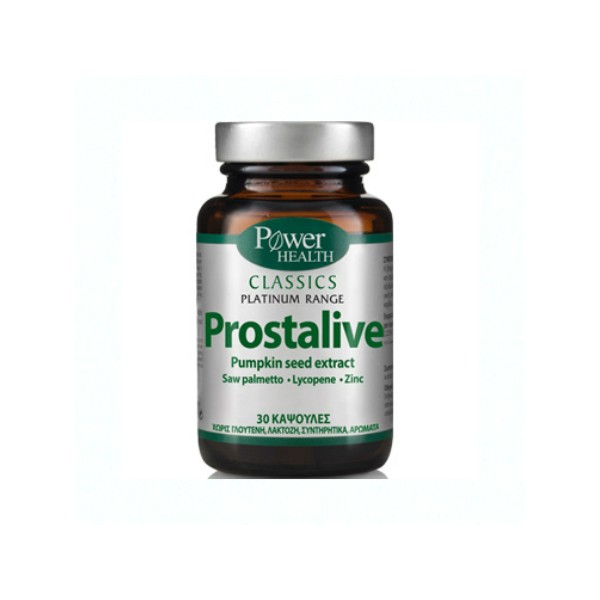 Ποιος είπε ότι οι άνδρες δεν έχουν το δικό τους… προστάτη; Η φύση έχει φροντίσει και γι’ αυτό, αποτελώντας τον απόλυτο σύμμαχο της ανδρικής φύσης με το Prostalive. To εξειδικευμένο υψηλής ποιότητας συμπλήρωμα διατροφής για την προστασία και την υγεία του προστάτη με Κολοκυθόσπορο, Saw palmetto, Λυκοπένιο, Ρόδι.To Prostalive αποτελεί μία πλούσια σύνθεση ενός συνδυασμού παραδοσιακών φυτών, όπως κολοκυθόσπορος, σερενόα και τσουκνίδα, τα οποία συμβάλλουν στη φυσιολογική λειτουργία του προστάτη. Η σύνθεση ενισχύεται με εκχυλίσματα λυκοπενίου και ροδιού, καθώς και με το ιχνοστοιχείο σελήνιο, το οποίο συμβάλλει στη φυσιολογική σπερματογένεση, όπως και τον ψευδάργυρο για τη διατήρηση των φυσιολογικών επιπέδων τεστοστερόνης στο αίμα.Οι Σπόροι κολοκυθόσπορου (Curcubita pepo L.):Φροντίζουν τη διευκόλυνση της διούρησης.Το Σερενόα (Saw Palmetto – Serenoa repens L.):Επαναφέρει τη φυσιολογική λειτουργία του προστάτη, μειώνει τα συμπτώματα της διόγκωσης.Η ρίζα Τσουκνίδας (Urtica dioica L.):Βελτιώνει την υγεία του προστάτη.Το Ρόδι (Punica granatum L.) :Προστατεύει τα αγγεία και την υγεία του προστάτη.Το Λυκοπένιο:Προέρχεται από τα κόκκινα φρούτα και λαχανικά και προστατεύει τον προστάτη.Τα Σελήνιο & Βιταμίνη Ε:Συνδυάζουν την ισχυρή αντιοξειδωτική προστασία και διευκολύνουν τη σπερματογένεση.Ο Ψευδάργυρος:Το ιχνοστοιχείο που προστατεύει τον προστάτη, και διατηρεί τα επίπεδα της τεστοστερόνης.Είναι κατάλληλο για:Άνδρες με ΚΥΠ (Kαλοήθη Yπερπλασία του Προστάτη)Άνδρες με δυσκολία ούρησηςΆνδρες άνω των 50 ετώνΣε τι ωφελεί:Φυσιολογική υγεία του προστατικού αδέναΠεριορισμό της συνεχούς αύξησης του μεγέθους του προστάτηΥγεία ουροποιητικού – αναπαραγωγικού συστήματοςΑνακούφιση από διαταραχές της ούρησηςΒελτίωση της ροής του αίματος στην περιοχή του προστάτηPlatinum Χαρακτηριστικά:Συνεργική, ολιστική δράση 8 διαφορετικών συστατικώνΚλινικά μελετημένα συστατικά με αποδεδειγμένα οφέλη στην υγεία του προστάτη