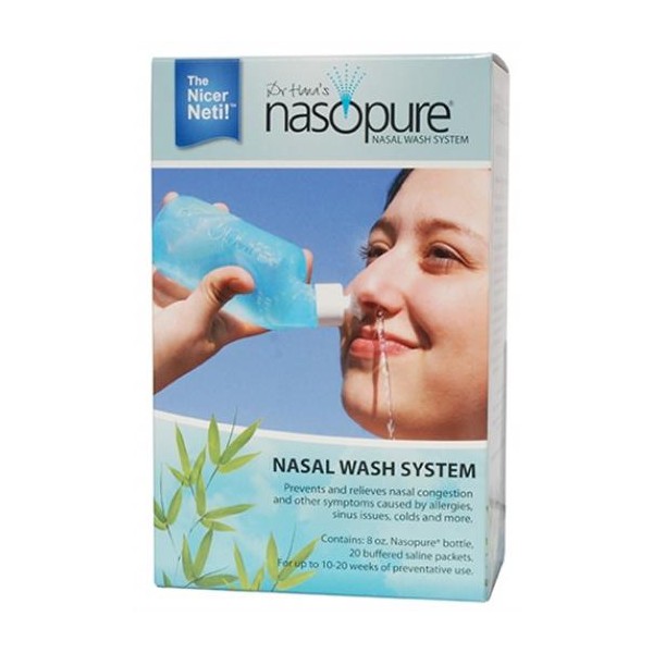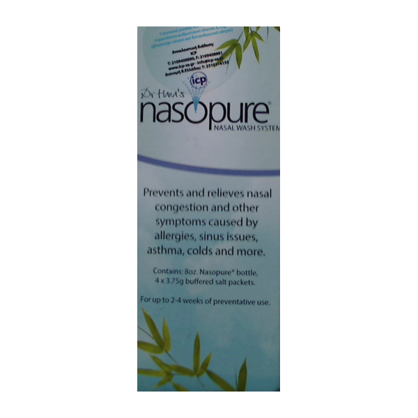 Η συσκευή Nasopure, χρησιμοποιούμενη με τα συνοδευτικά φακελάκια ρυθμιστικού άλατος απομακρύνει από τη μύτη τις ερεθιστικές ουσίες, τα ξένα σωματίδια και τα υπολείμματα βλέννας.Το ρυθμιστικό διάλυμα άλατος καθαρίζει τις ρινικές διόδους, ενώ ενυδατώνει και καταπραϋνει τις ερεθισμένες μεμβράνες.