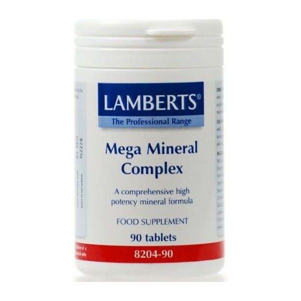 Το προϊόν αυτό αποτελεί πιθανότατα ένα από τα πιο πλήρη και υψηλής δραστικότητας, σκευάσματα μετάλλων που κυκλοφορούν στην παγκόσμια αγορά. Μπορεί να χρησιμοποιηθεί παράλληλα με ταυτόχρονη χρήση βιταμινών, που θα λαμβάνονται είτε μέσω μιας πολυβιταμινούχου φόρμουλας είτε μέσω ξεχωριστών συμπληρωμάτων διαφόρων βιταμινών. Το Mega Mineral Complex της Lamberts, παρέχει μέταλλα σε υψηλά απορροφήσιμες μορφές.Τα υψηλά επίπεδα ασβεστίου και μαγνησίου που περιλαμβάνονται στο σκεύασμα αυτό, το καθιστούν ιδανικό συμπλήρωμα διατροφής για την εξασφάλιση της υγείας των οστών.Ταμπλετοποίηση με:Cellulose, Tablet Coating (Hydroxypropyl Methylcellulose, Glycerin), Stearic Acid, Crosslinked Cellulose Gum, Magnesium Stearate.Χρόνος αφομοίωσης: Λιγότερο από 1ώρα. Κατάλληλο για χορτοφάγους.Αλλεργίες: Καμία.Προφυλάξεις:Αυτό το προϊόν περιέχει σίδηρο, του οποίου αν γίνει κατάχρηση, μπορεί να είναι βλαβερό για τα μικρά παιδιά. Φυλάξτε τα σε σημείο ασφαλές από τα παιδιά.Να φυλάσσεται σε δροσερό και ξηρό περιβάλλον και να προφυλάσσεται απτό φως.