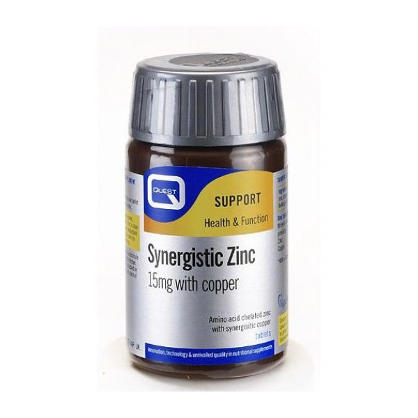 Το συμπλήρωμα διατροφής Synergistic Zinc 15mg της Quest παρέχει στον οργανισμό ψευδάργυρο και χαλκό που αυξάνει τη απορρόφησή του.