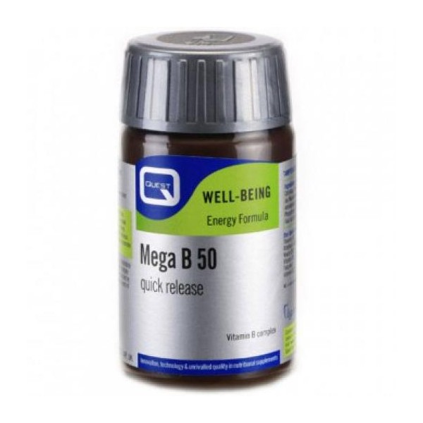 Το συμπλήρωμα διατροφής Mega B50 quick release της Quest περιέχει σύμπλεγμα βιταμινών Β, οι οποίες ενισχύουν την απελευθέρωση ενέργειας από την τροφή και μπορεί να ελαττώσουν την κόπωση και να υποστηρίξουν την αυτοσυγκέντρωση και τη μνήμη. Επίσης, το σύμπλεγμα βιταμινών Β απαιτείται για ένα υγιές νευρικό σύστημα. Το φυλλικό οξύ, η Β6 και η Β12 εμπλέκονται στην παραγωγή αίματος. Δίαιτες πλούσιες σε υδατάνθρακες και έντονη φυσική δραστηριότητα αυξάνουν τις απαιτήσεις σε βιταμίνες B.- Περιέχει 8 βιταμίνες B μαζί με χολίνη, ινοσιτόλη και PABA- Περιέχει 400mg φυλλικού οξέος μαζί με B6 και B12 που είναι απαραίτητα για υγιή επίπεδα ομοκυστεΐνης στο αίμα- Ταμπλέτα γρήγορης αποδέσμευσης (quick release), σχεδιασμένη να απελευθερώνει θρεπτικά συστατικά μέσα σε 30 λεπτά- Δεν περιέχει μαγιά- Κατάλληλο για χορτοφάγους και vegans