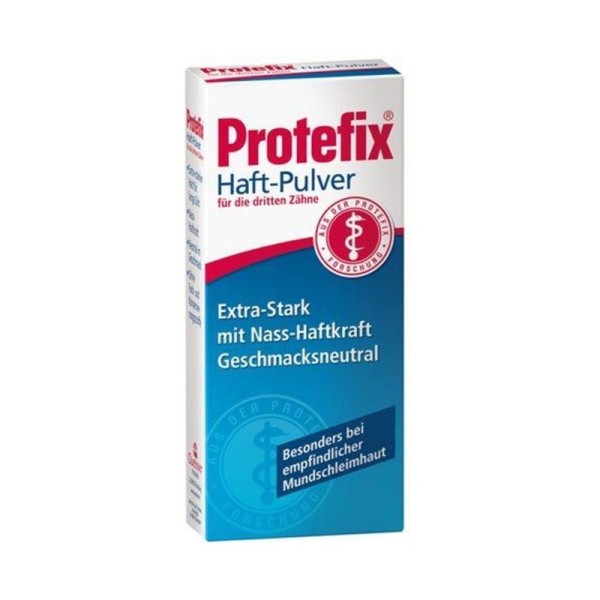 Η PROTEFIX σκόνη επικόλλησης είναι το κλασσικό επικολλητικό : ιδανικό για μικρότερα προβλήματα επικόλλησης και για αραιό σάλιο. Είναι εύκολη στη χρήση : πασπαλίστε την υγρή οδοντοστοιχία και μόλις την τοποθετήσετε στη θέση της, δημιουργείται η σίγουρη και μακράς διάρκειας επικόλληση. Η επικόλληση με φυσικά υλικά είναι η καλύτερη!Η PROTEFIX σκόνη επικόλλησης περιέχει 99% αλγινικό νάτριο, ένα απόλυτα φυσικό υλικό. Είναι μη γλοιώδες, άγευστο και άοσμο, απόλυτα συμβατό και αυτό έχει αποδειχθεί με το πέρασμα των χρόνων. Αν η οδοντοστοιχία σας χαλαρώσει, μπορείτε να την ΄΄διορθώσετε΄΄ όπου και αν είστε.