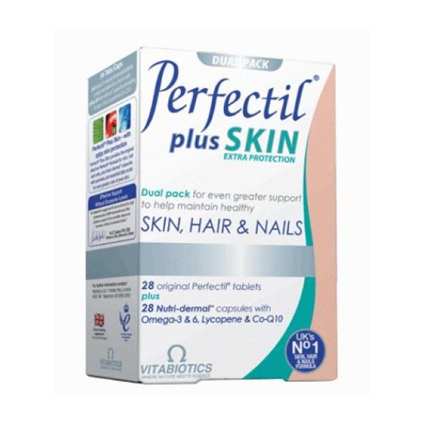 Το συμπλήρωμα διατροφής Perfectil Plus της Vitabiotics είναι μια μοναδική διπλή συσκευασία που συνδυάζει τις ταμπλέτες Perfectil με τις δερμο-θρεπτικές κάψουλες με ωμέγα-3 & 6 λιπαρά οξέα, λυκοπένιο, λουτεΐνη και συνένζυμο Q10. Οι ταμπλέτες Perfectil περιέχουν τυποποιημένο εκχύλισμα σταφυλιού, βιταμίνες C, Ε και καροτενοειδή που προσφέρουν ισχυρή αντιοξειδωτική προστασία στο δέρμα, προστατεύουν το κολλαγόνο και την ελαστίνη και βοηθούν στη σωστή μικροκυκλοφορία του αίματος, ενώ το παντοθενικό οξύ μπορεί να βοηθήσει κατά της ξηροδερμίας. Η βιοτίνη, η L-κυστίνη, η βιοτίνη και τα ιχνοστοιχεία, όπως οσίδηρος, ο ψευδάργυρος και ο χαλκός, συμβάλλουν στην υγιή ανάπτυξη της τρίχας, στην υγεία του θύλακα και στην αντοχή των μαλλιών. Επιπλέον, ο ψευδάργυρος, ο σίδηρος και η L-κυστεΐνη συμβάλλουν στην υγεία και την ανάπτυξη των νυχιών. Οι δερμο-θρεπτικές κάψουλες του Perfectil Plus προσφέρουν συστατικά για την ενίσχυση της υγείας του δέρματος. Τα ωμέγα-3 & 6 λιπαρά οξέα βοηθούν στην ακεραιότητα των κυττάρων του δέρματος και στη διατήρησης της φυσικής απόχρωσης του δέρματος. Το λυκοπένιο και η λουτεΐνη παρέχουν ισχυρή προστασία στο δέρμα από τον ήλιο, που είναι ο Νο 1 παράγοντας γήρανσης, χαλάρωσης και δημιουργίας ρυτίδων στο δέρμα και το συνένζυμο Q10 έχει σημαντική αντιοξειδωτική δράση.Χαρακτηριστικά Σύνθεσης- Σύνθεση μιας ταμπλέτας και μιας κάψουλας την ημέρα- Ακόμα μεγαλύτερη υποστήριξη για το δέρμα