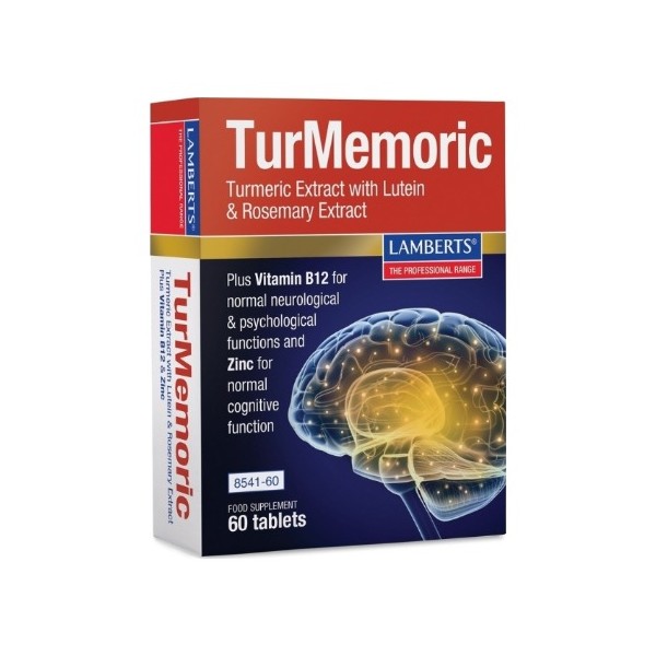 Το TurMemoric της Lamberts αποτελεί συμπλήρωμα διατροφής που περιέχει έναν μοναδικό συνδυασμό μικροθρεπτικών συστατικών.Πιο συγκεκριμένα παρέχει (στην συνιστώμενη δόση των δυο ταμπλετών ημερησίως):• 500mg τιτλοδοτημένου εκχυλίσματος ρίζας Κουρκουμά που ισοδυναμεί με 10.000mg σκόνης του μπαχαρικού. Αυτή η ποσότητα είναι περίπου ίση με δύο κουταλάκια του γλυκού σκόνης μπαχαρικού, κάτι που καθιστά το Turmemoric της Lamberts ως ένα από τα πιο ισχυρά προϊόντα Κουρκουμά που κυκλοφορούν στην Αγγλία. Ο κουρκουμάς αποτελεί ένα από τα ευρύτερα χρησιμοποιούμενα μπαχαρικά. Η κύρια ομάδα δραστικών ουσιών του κουρκουμά είναι τα κουρκουμινοειδή και κυρίως η κουρκουμίνη, η οποία δίνει το χαρακτηριστικό κίτρινο χρώμα στο μπαχαρικό και αποτελεί τα τελευταία χρόνια αντικείμενο ευρύτατων μελετών στην Επιστήμη της Διατροφής. Το Eκχύλισμα Ρίζας Κουρκουμά του TurMemoric αποδίδει εγγυημένα 95% κουρκουμινοειδών.• Υψηλή ποσότητα από τα δύο σημαντικότερα καροτενοειδή: Λουτείνη και Ζεαξανθίνη. Η λουτεΐνη και η ζεαξανθίνη ανήκουν στα καροτενοειδή και βρίσκονται σε αφθονία στα φρούτα και στα πράσινα λαχανικά. Δεν παρασκευάζονται από τον οργανισμό, γι’ αυτό και πρέπει να λαμβάνονται μέσα από τις τροφές ή τα συμπληρώματα διατροφής.• 500μg Βιταμίνης Β12 η οποία συμβάλλει* στη φυσιολογική λειτουργία του νευρικού συστήματος και στην φυσιολογική ψυχολογική λειτουργία. (*Ευρωπαϊκός Κανονισμός 432/2012)• 5mg Ψευδάργυρου, ο οποίος συμβάλλει* στη φυσιολογική γνωσιακή λειτουργία (*Ευρωπαϊκός Κανονισμός 432/2012)• Τιτλοδοτημένο (ως 7.5:1) εκχύλισμα δενδρολίβανουΌπως όλα τα σκευάσματα της Lamberts, παρασκευάζεται εντός του Ηνωμένου Βασιλείου σύμφωνα με τα αυστηρά πρότυπα της Φαρμακευτικής GMP (Pharmaceutical GMP).Το TurMemoric της Lamberts είναι κατάλληλο για χορτοφάγους και vegans.