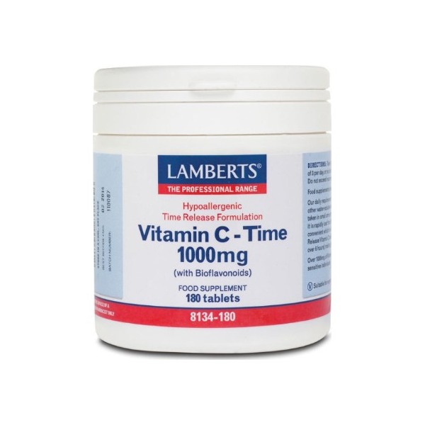 Η βιταμίνη C αποτελεί μια υδατοδιαλυτή βιταμίνη και μια από τις σημαντικότερες Βιταμίνες για τον ανθρώπινο οργανισμό καθώς αυξάνει την απορρόφηση του σιδήρου και συμβάλλει*:• στη διατήρηση της φυσιολογικής λειτουργίας του ανοσοποιητικού συστήματος κατά τη διάρκεια και μετά από έντονη σωματική άσκηση• στο φυσιολογικό σχηματισμό του κολλαγόνου για τη φυσιολογική λειτουργία των αιμοφόρων αγγείων, των οστών, των χόνδρων, των ούλων, των δοντιών και του δέρματος• στη φυσιολογική λειτουργία των μεταβολικών διεργασιών που αποσκοπούν στην παραγωγή ενέργειας• στη φυσιολογική λειτουργία του νευρικού και του ανοσοποιητικού συστήματος• στη φυσιολογική ψυχολογική λειτουργία• στην προστασία των κυττάρων από το οξειδωτικό στρες• στη μείωση της κούρασης και της κόπωσηςΟι ανάγκες του οργανισμού σε Βιταμίνη C είναι μεγαλύτερες από οποιαδήποτε άλλη υδατοδιαλυτή βιταμίνη και ο ιδανικός τρόπος πρόσληψης της είναι σε μικρές ποσότητες, συνεχόμενα κατά τη διάρκεια όλου του εικοσιτετραώρου, κάτι που είναι πολύ δύσκολο. Για την επίλυση του προβλήματος αυτού η Lamberts δημιούργησε τις ταμπλέτες Βιταμίνης C Time Release (ελεγχόμενης αποδέσμευσης). Οι ταμπλέτες παράγονται μετά από μία ειδική διαδικασία, η οποία διατηρεί τα θρεπτικά στοιχεία σε μικροσφαιρίδια, επιτρέποντάς την σταδιακή απελευθέρωση τους κατόπιν της κατάποσης. Με τον τρόπο αυτό επιτυγχάνεται η σταδιακή και συνεχόμενη απορρόφηση της Βιταμίνης C η οποία διαρκεί για περίπου 6 με 8 ώρες.To σκεύασμα Vitamin C Time Release 1000mg της Lamberts παρέχει εγγυημένα 1000mg Βιταμίνης C σε δισκία ελεγχόμενης αποδέσμευσης και μία σημαντική ποσότητα βιοφλαβονοειδών (ρουτίνη, κερσετίνη, κιτρίνη και εσπεριδίνη)τα οποία συμβάλλουν στην απορρόφησή της από τον οργανισμό και σκόνη καρπών αγριοτριανταφυλλιάς (Rose Hips). Όπως όλα τα σκευάσματα της Lamberts, παρασκευάζεται εντός του Ηνωμένου Βασιλείου σύμφωνα με τα αυστηρά πρότυπα της Φαρμακευτικής GMP (Pharmaceutical GMP).