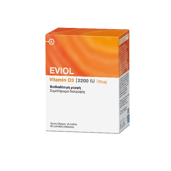 Διατήρηση των φυσιολογικών επιπέδων του ασβεστίου.Οι μαλακές κάψουλες EVIOL Vitamin D3 περιέχουν τη λιποδιαλυτή βιταμίνη D3 (χοληκαλσιφερόλη) που συμβάλλει στη διατήρηση των φυσιολογικών επιπέδων ασβεστίου στο αίμα, καθώς επίσης και στην ομαλή απορρόφηση του ασβεστίου και του φωσφόρου. Επιπλέον, η βιταμίνη D3 παίζει σημαντικό ρόλο στη διατήρηση της φυσιολογικής κατάστασης των οστών και των δοντιών. Κατάλληλο για άτομα με έλλειψη σε βιταμίνη D, με μειωμένη έκθεση στον ήλιο, με ενδείξεις οστεοπόρωσης και ηλικιωμένους.