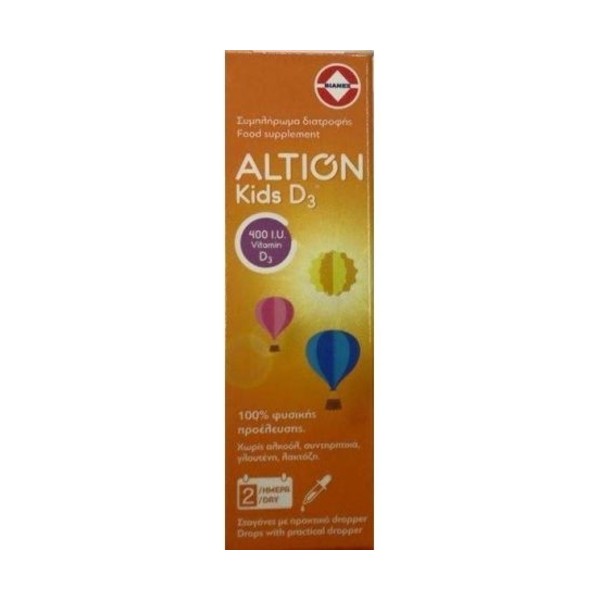 Με 2 σταγόνες από το νέο συμπλήρωμα διατροφής ALTION Kids D3? την ημέρα μπορείς να καλύπτεις τις καθημερινές ανάγκες των νεογνών και των παιδιών σε Βιταμίνη D για τη σωστή ανάπτυξή τους (400IU βιταμίνης D3). Επιπλέον μπορείς να ενισχύσεις και το ανοσοποιητικό των παιδιών με τον πιο γρήγορο τρόπο μέσω του πρακτικού dropper.